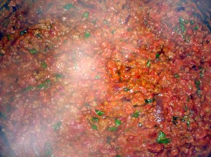 On to the pasta. What’s in the pantry? Whole wheat penne, a can of whole stewed plum tomatoes, some concentrated tomato paste, sun-dried tomatoes in oil and some red onion. And in the fridge…some leftover uncooked ground chuck from slider-making, and some fresh basil and oregano from the garden, plus some more of the above mentioned herbed goat cheese. This combo reminded me of some of the flavors from an old fashioned recipe which makes a lasagna-like hamburger meat dish called “That Casserole,” so I’ve decided to call this “That Pasta,” and you’ll find the recipe here. I browned the beef while bringing a large pot of water to boil for the pasta. Then I drained off the fat from the cooked meat with a slotted spoon and set the beef aside in a small bowl lined with paper towels. Next, pour or wipe out any remaining fat from the pan used to cook the meat, and to the same pan add some extra virgin olive oil and the onions, cooking them until they are soft and starting to lightly brown. Add the can of tomatoes and their juice to the onions, and break up the tomatoes with a spoon. Then add the tomato paste, chopped sun-dried tomatoes, chopped oregano, salt and pepper and let this cook down for about 15 minutes.