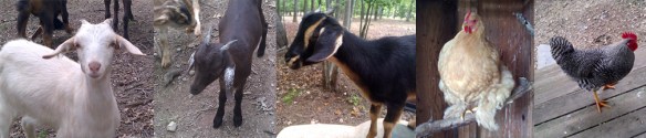 The very cutest of goats: Tinkerbell, Mocha Freckles and Cuddles, and some fine feathered friends in buff and black and white speckled.