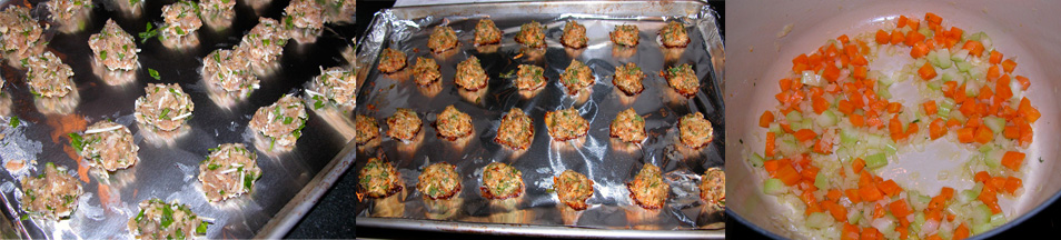 Chicken sausage meatballs before and after, and the trinity of onion, carrot and celery for the base of the soup.