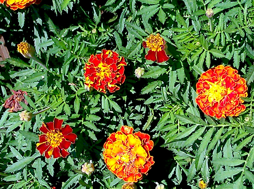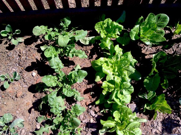 (Above) This was some of the prettiest lettuce I’ve seen in a garden. Below is a baby lettuce patch, some marigolds and one of the last tomatoes of the season.