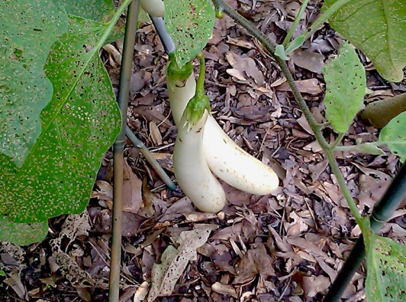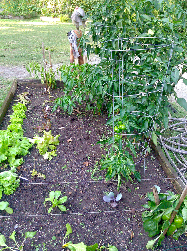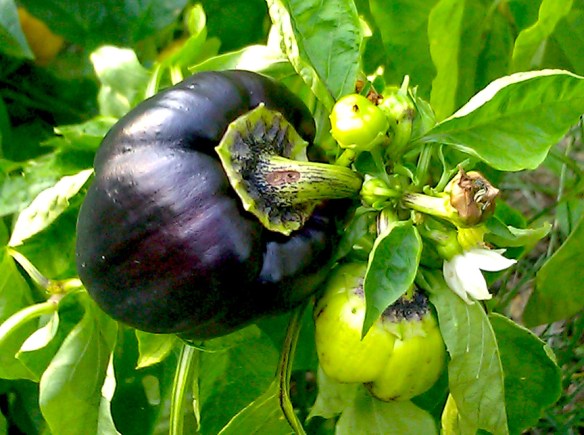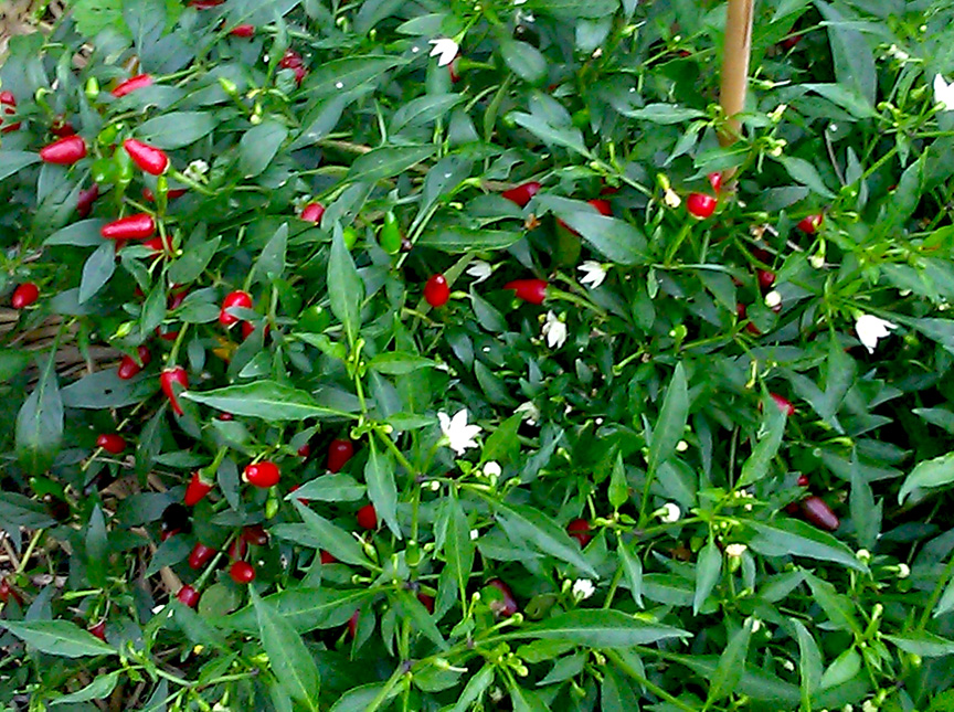 The peppers in this garden were doing just fine and I can’t show them all, but here are two lovely bell peppers, red and purple, and some little tiny red peppers…ornamental perhaps?
