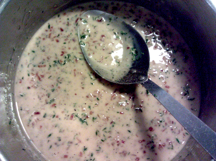 You’ve seen my most favorite of pizza concoctions in the form of the Pizza with Prosciutto and Arugula from the Cheater Pizza post, but this is another fave that I resurrected last night after having forgotten about it for a while. My quirky version of a “white” pizza has a very delicate sauce by comparison to the traditional garlic sauces I’ve tasted. Because of this, you should only use a plain crust because a whole wheat one can be overwhelming to the flavors, unless it is very, very light. I don’t remember how I came up with this recipe, but I suspect it was one of those “what do I have in the fridge” moments! Hope you’ll enjoy it.
