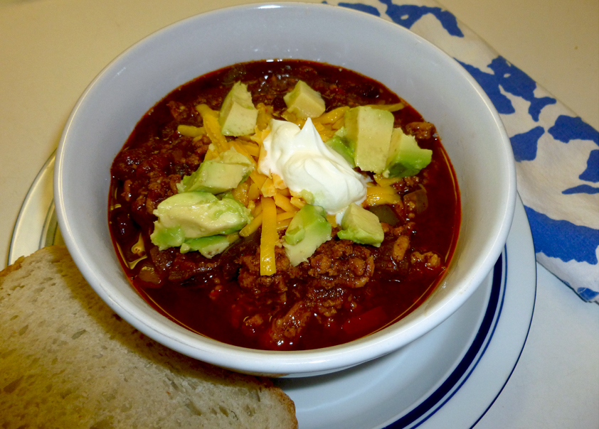 chiliinbowl1 Published October 12, 2011 at 842 × 604 in Holy Mole, It’s Chili! Serve with grated extra sharp cheddar, avocado and creme fraiche to make it more decadent.