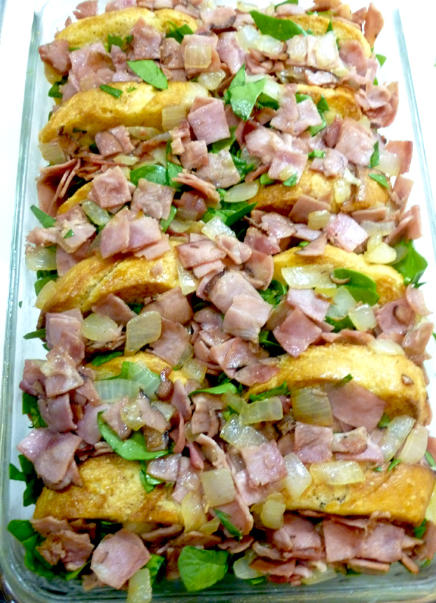 ham, spinach onion Published November 24, 2011 at 624 × 864 in Holiday Happiness: Ham, Fontina and Spinach Bread Pudding Ham, onion and spinach get tucked between the slices of custard soaked bread.