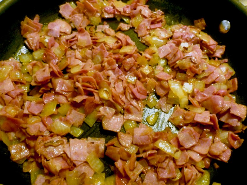 hamonions Published November 24, 2011 at 864 × 648 in Holiday Happiness: Ham, Fontina and Spinach Bread Pudding Ham joins the sauteed onion.