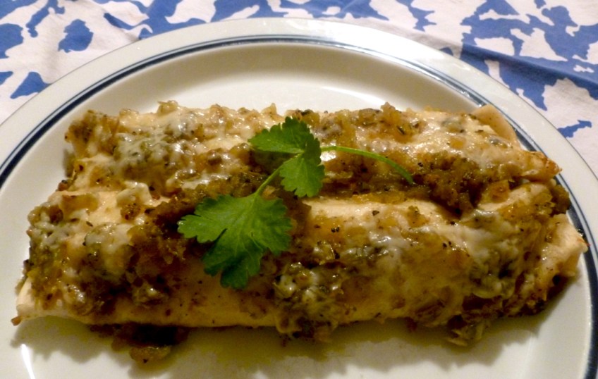 enchilada1B2 Published January 13, 2012 at 1080 × 686 in Friday the 13th and Easy Enchiladas Verdes Alas, another night shot which really doesn’t do these justice, a wrinkle in my cloth, and my little digital camera ran out of space in the middle of shooting…plus I was hungry!