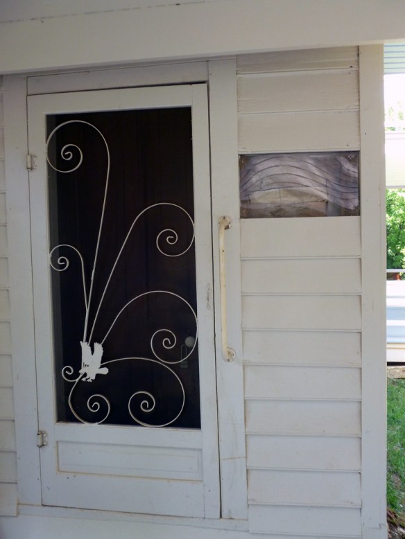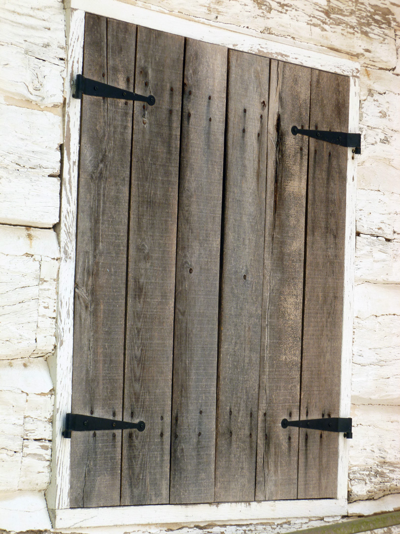 A side screen door on the wing house which is currently being renovated to open to the public. The “window to the past” at the right of the door shows the original log construction of the home. Some plasters used on the property contain animal hair to help bond and cement the timbers.