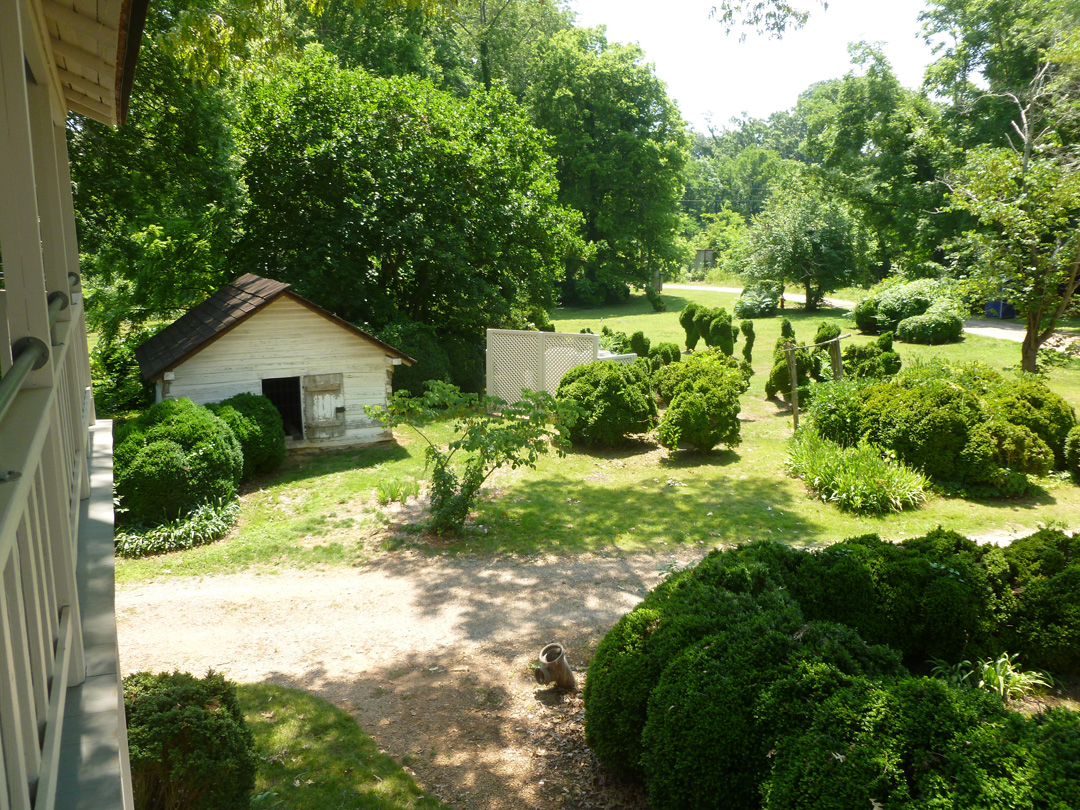 This view from the upper porch on the back of the main house is of the Ice House and the gardens next to it. The stables, which are in dire need of restoration are to the right.