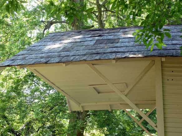 Here you can see some detail of the original metal shingles that were on the main houses as well, but now only this one metal roof remains intact.