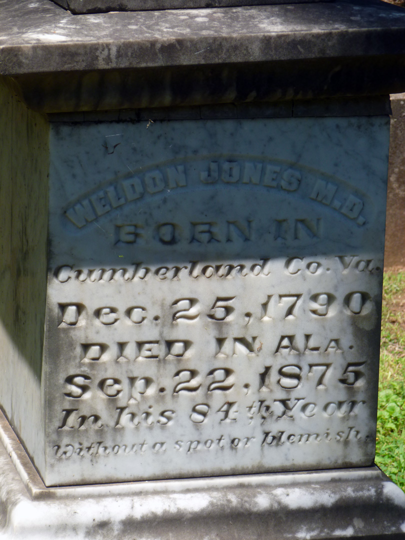The inscription on a monument from a family in the cemetery reads that this one died at age 84 “without a spot or blemish.”