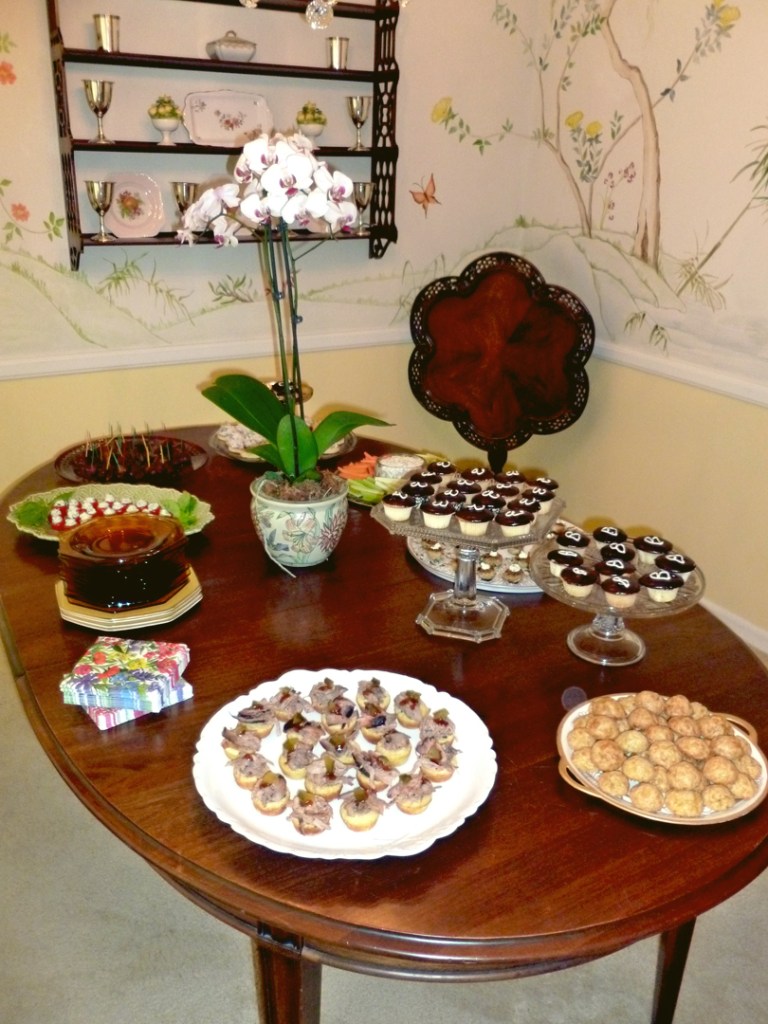 Though none of my pictures came out too well, this is my final table of food. Clockwise from the bottom front: Cornbread tartlets with BBQ Pork, goat cheese stuffed tomatoes, bacon wrapped dates, tarragon chicken salad on brioche crostini, caramelized shallot and blue cheese dip and veggies, crab cakes with lemon chive aioli, mini cupcakes and cheese olive bites. The dining room walls were painted by my mom when I was a child…aren’t they pretty?