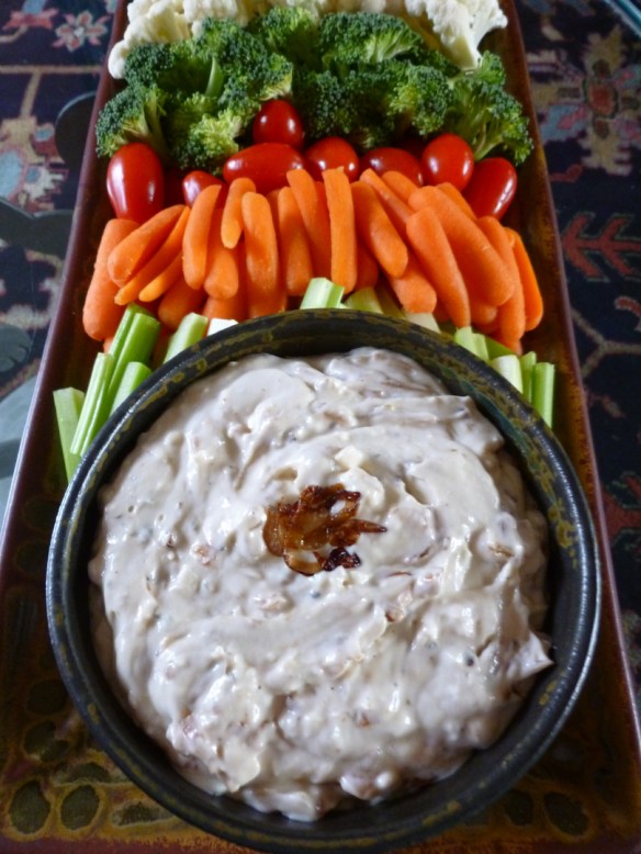 Today I want to revisit and share a relatively easy and very yummy dip recipe from my “repertoire.” For those of you who are football fans, this is a great one to make for the upcoming American football and Super Bowl game parties, or down the road a way for rugby, soccer or baseball gatherings. It’s always been a hit for pot-lucks, Formula One racing parties and as a part of any appetizer spread. It’s definitely a rift on an old-fashioned traditional dry soup-based dip that we’ve all known in this country (and secretly loved), but transcends the original in every way. Yes, we’re talking about the ultimate chip and veggie dip: Caramelized Shallot and Blue Cheese Dip, and I’m making it to take to a little cocktail and nosh event this evening.