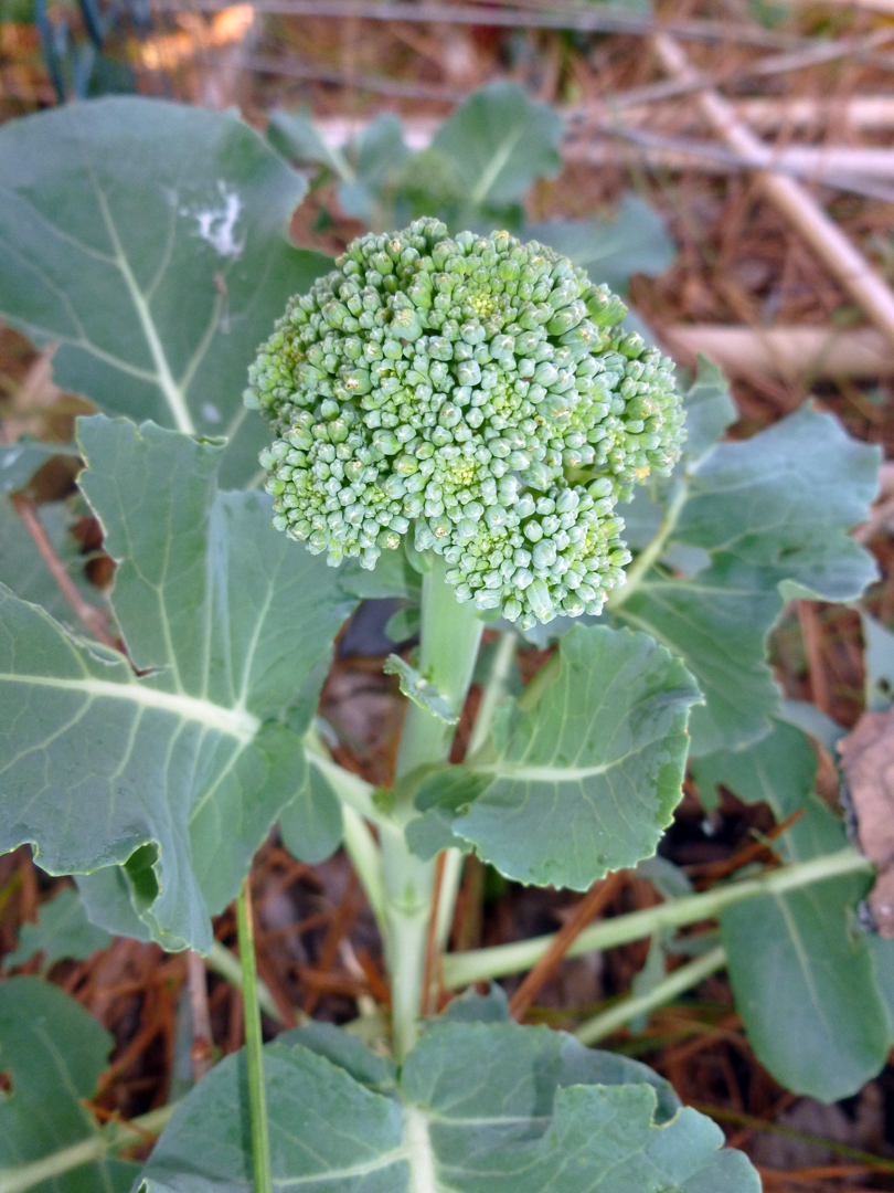 • Your broccoli looks like it is ready to harvest. I don’t think it is going to get any bigger. Cut just above the baby. Once the baby matures, cut it with the main stem, you do not want to have too many skinny babies.