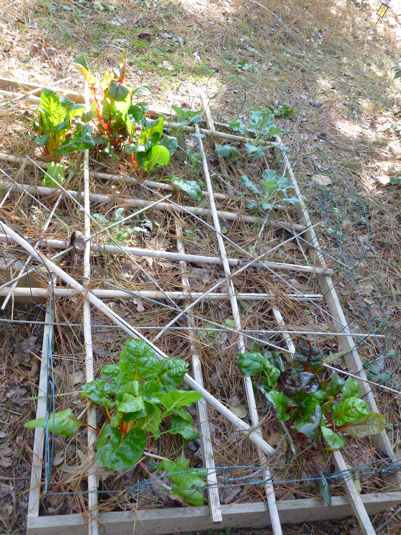A row of Rainbow chard. Yes, my “pick up stick” technique is still keeping cats out of the garden.