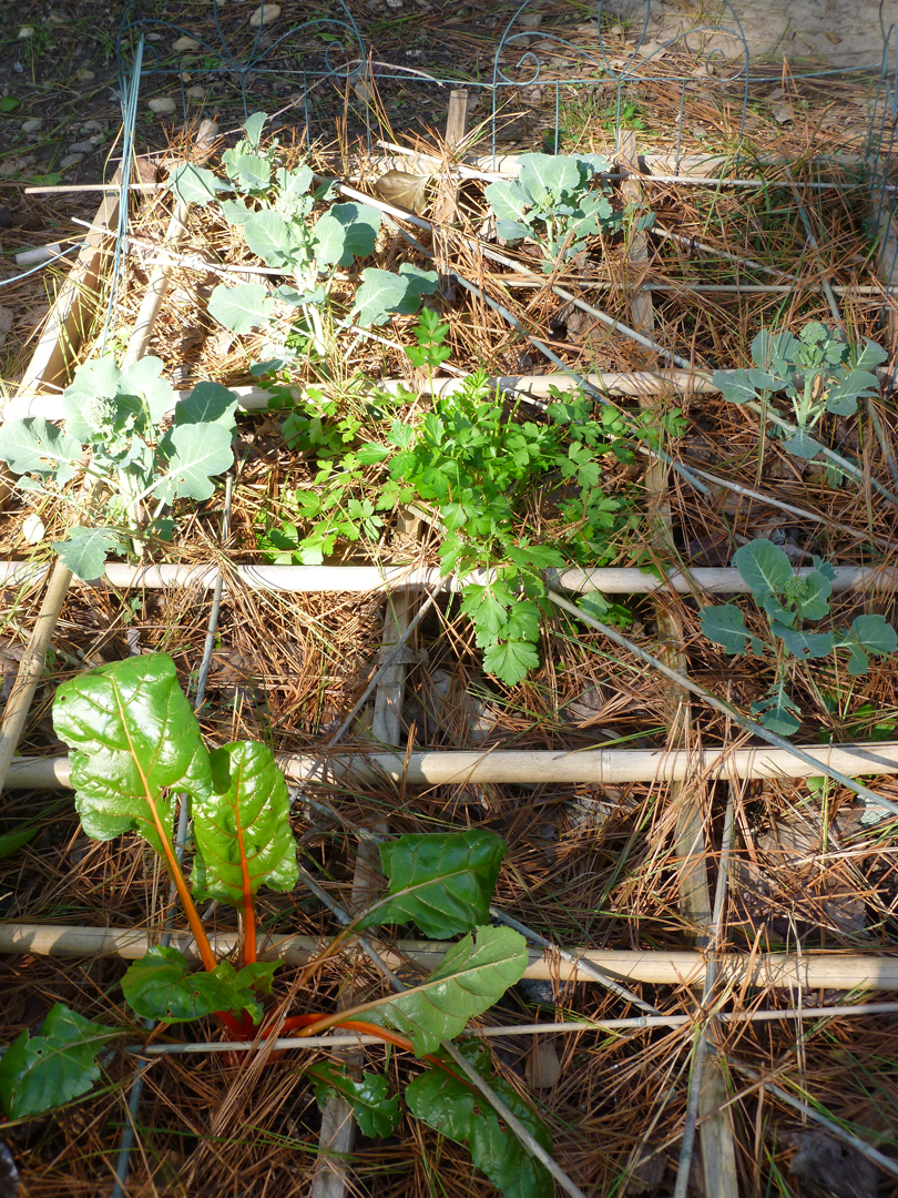 Italian flat leaf parsley left from summer (freshly harvested), surrounded by broccoli and hopefully some arugula at some point. And oh yes, more chard…a good year for it!