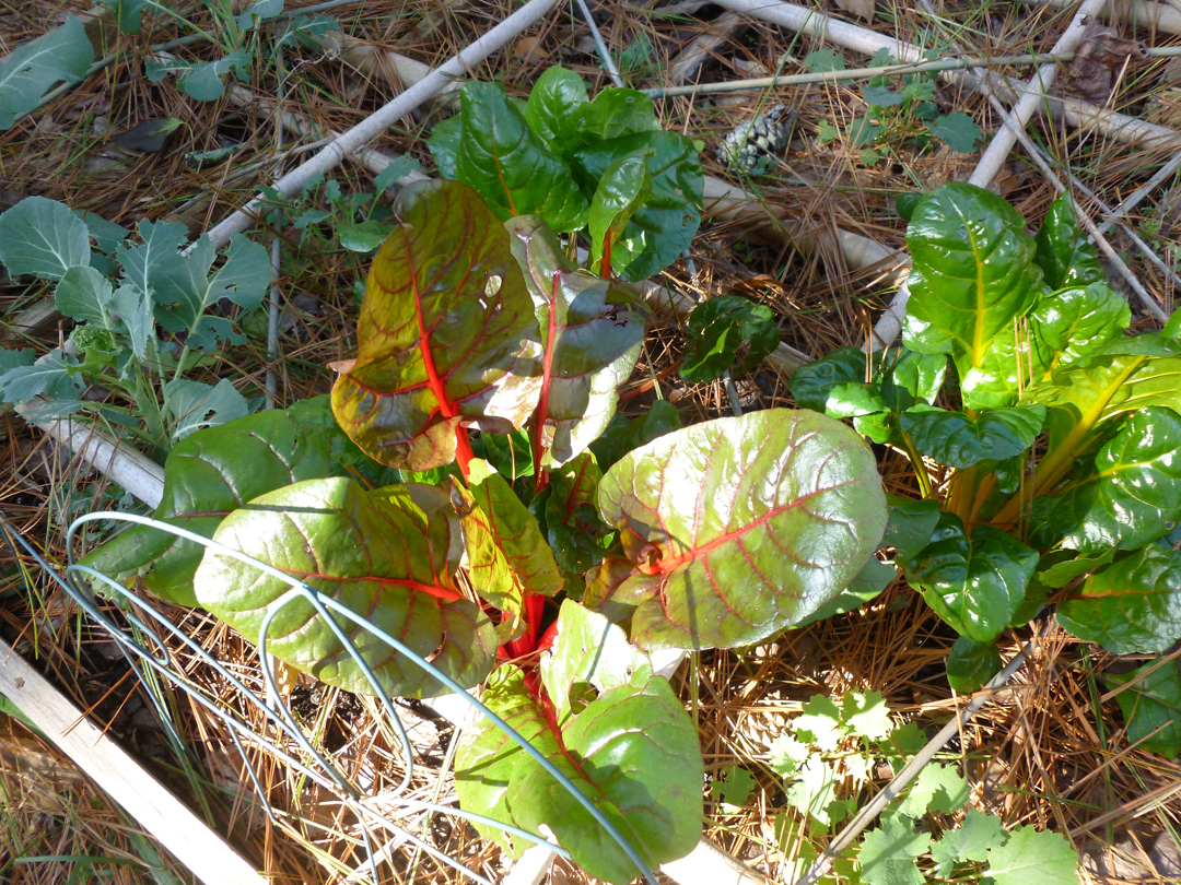 Chard in foreground and background, then carrots Lacinato and Red Russion Kale, Collards and broccoli. Pine straw and pine cones are a constant this time of year, providing mulch (good) and rather painful and prickly encounters if your timing is bad!