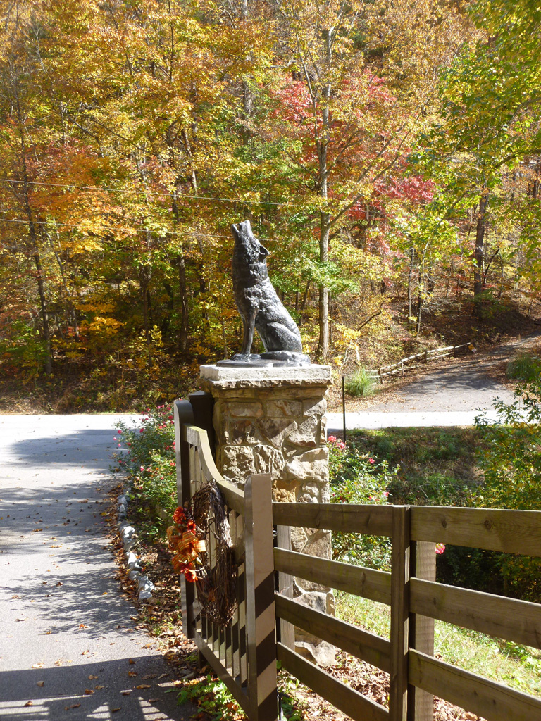 WolfatWolf Published November 7, 2013 at 768 × 1024 in Fall Frolic and a Warming Ham, Potato and Cabbage “Chowder” Leaving Wolf Mountain Vineyards, two Wolves flank the entrance/exit gate.