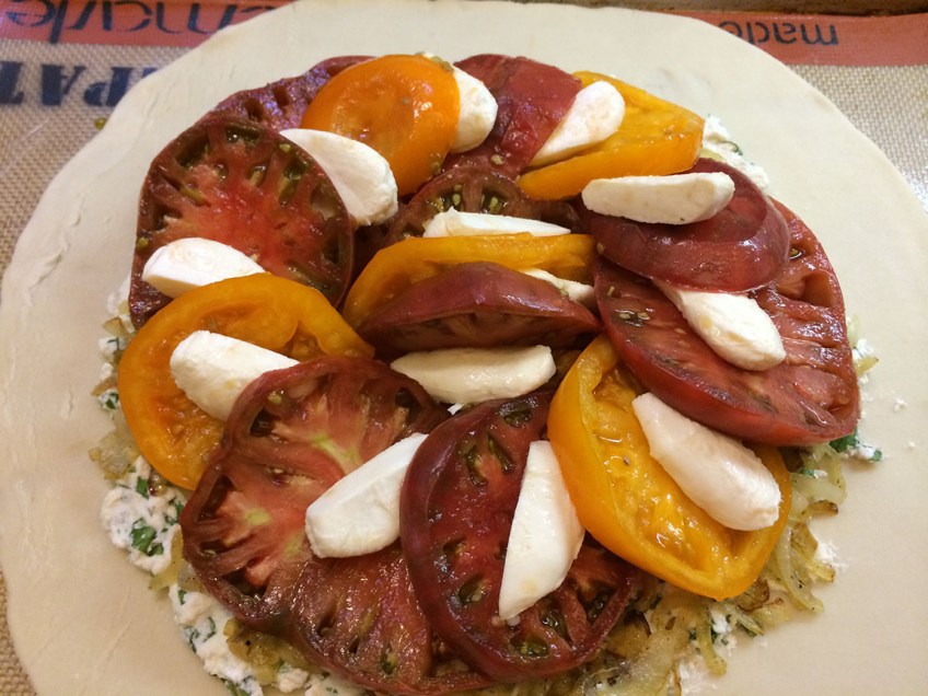tomatoandcheeselayer Published September 8, 2014 at 1152 × 864 in Last of Summer’s Bounty: Rustic Heirloom Tomato and Caramelized Onion Tart Third layer is tomatoes and mozzarella.