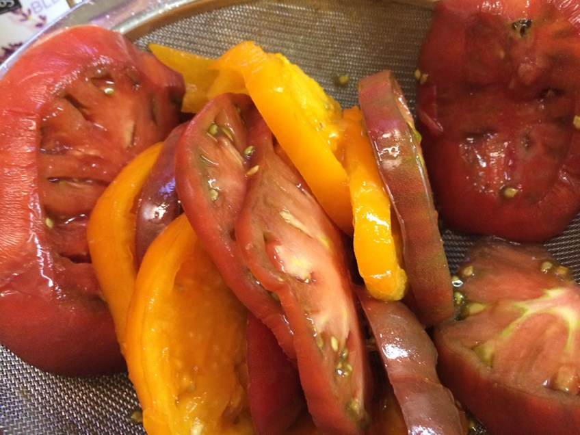 tomatoesdraining Published September 8, 2014 at 1152 × 864 in Last of Summer’s Bounty: Rustic Heirloom Tomato and Caramelized Onion Tart Lightly salt and drain your tomato slices.