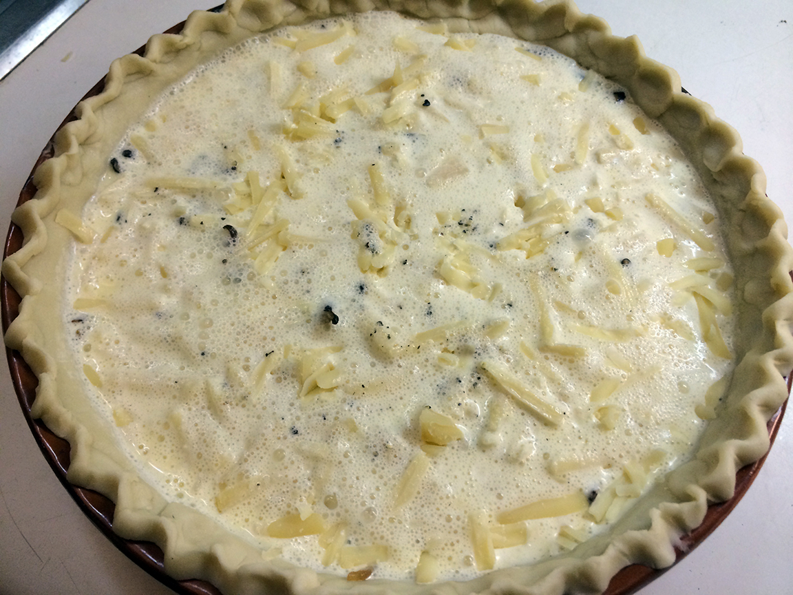 filled Published January 21, 2015 at 1152 × 864 in Rustic Spinach, Pancetta, Wild Mushroom and Caramelized Onion Quiche Filled and ready for the oven.