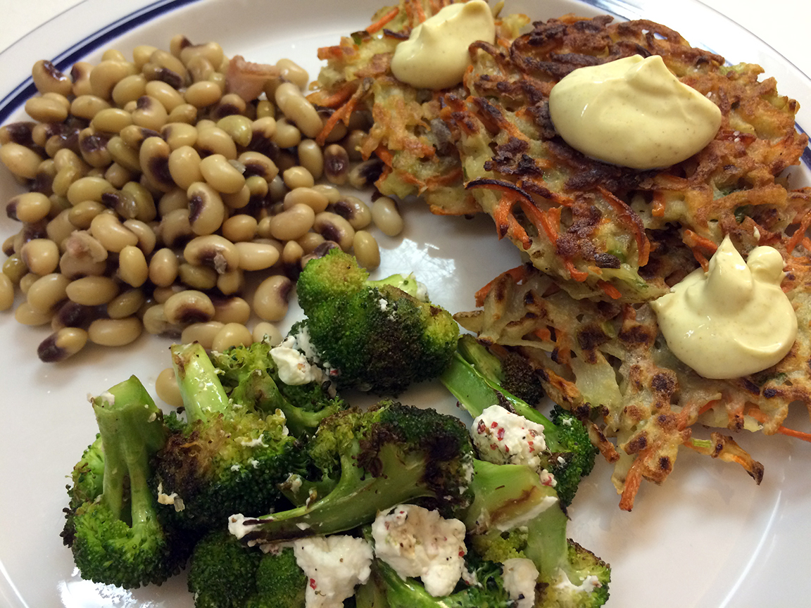 platefullofveg2 Published September 8, 2015 at 1152 × 864 in It’s the Simple Things Some seriously good eats. Field peas, charred broccoli with lemon and goat cheese and Cooking Light’s carrot and potato pancakes with curried yogurt dipping sauce. Vegetarian delight!