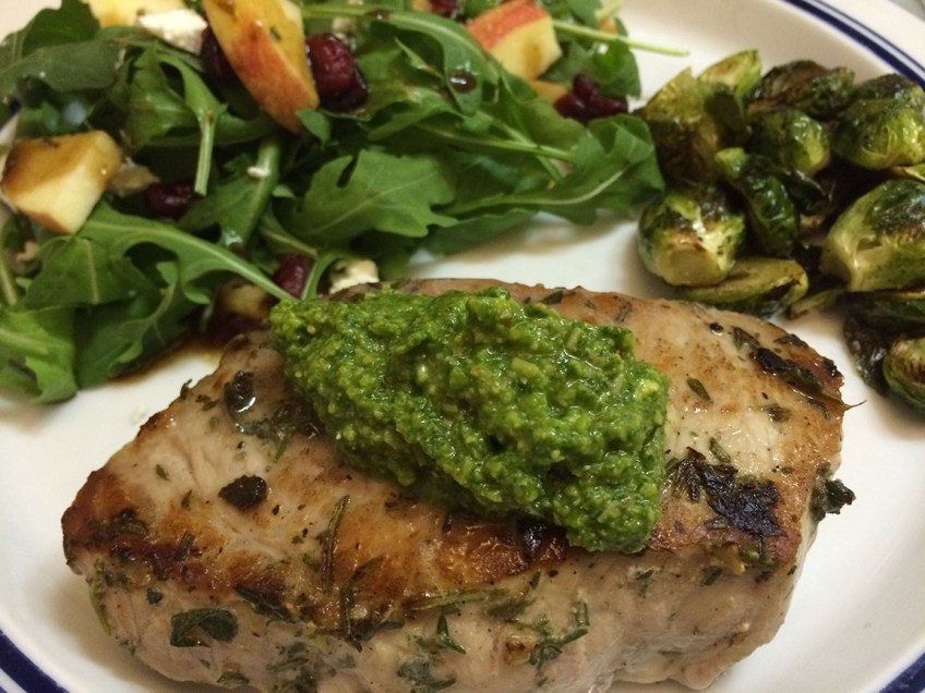 pork chop Published November 20, 2015 at 1152 × 864 in Refrigeration Inspiration and a Little Surprise! Night lighting, but a sumptuous herbed pork chop with arugula pesto.