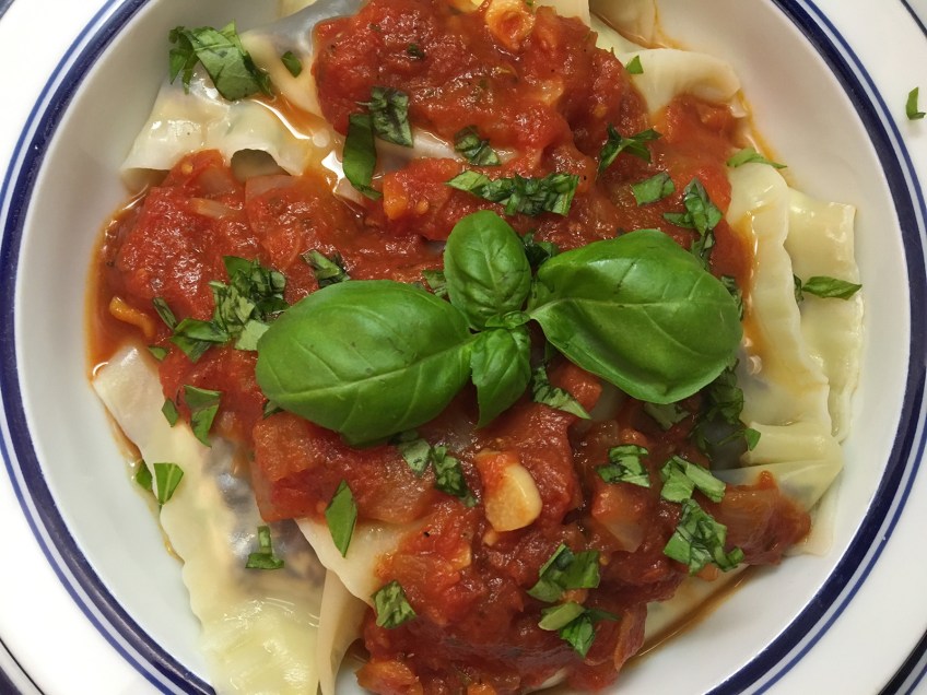 finishedravioli1 Published May 23, 2016 at 1600 × 1200 in Herbed Ricotta and Olive Tapenade Ravioli with Tomato Sauce and Fresh Basil Finish the ravioli with sauce and garnish with fresh basil.