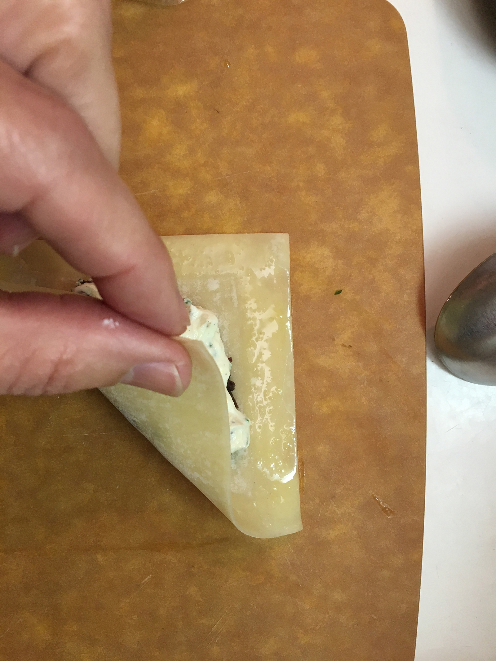 Process2 Published May 23, 2016 at 1600 × 2133 in Herbed Ricotta and Olive Tapenade Ravioli with Tomato Sauce and Fresh Basil Gently fold opposite corners to make a triangle.