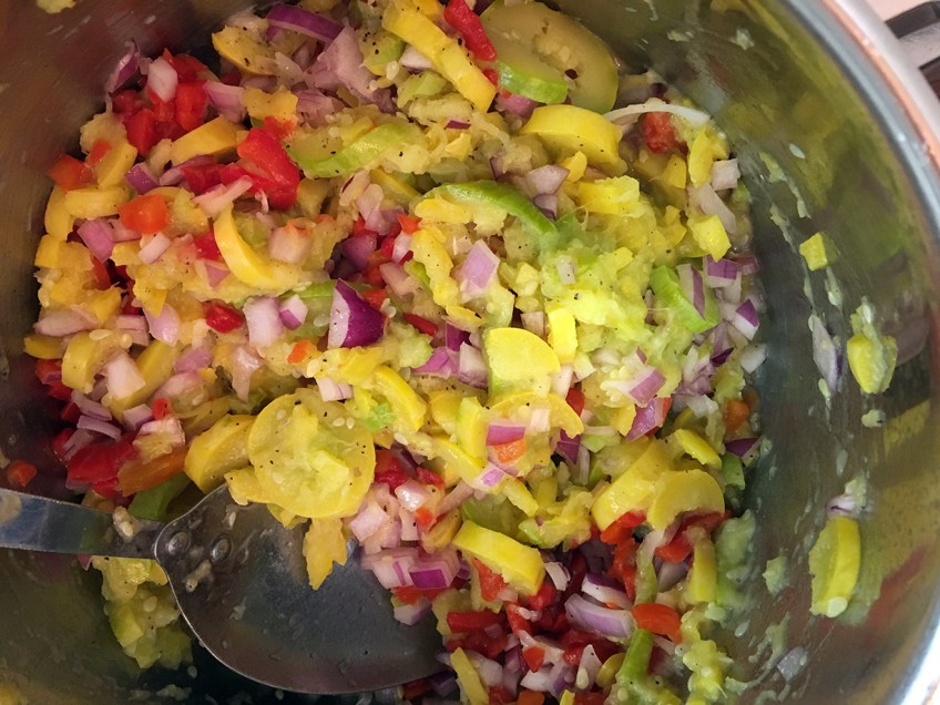 squashingredients3 Published September 28, 2016 at 1224 × 918 in Southern Comfort Food: Pimento and Cheese Squash Casserole Add the onions, pimento, half the cheese, and some butter to the squash.
