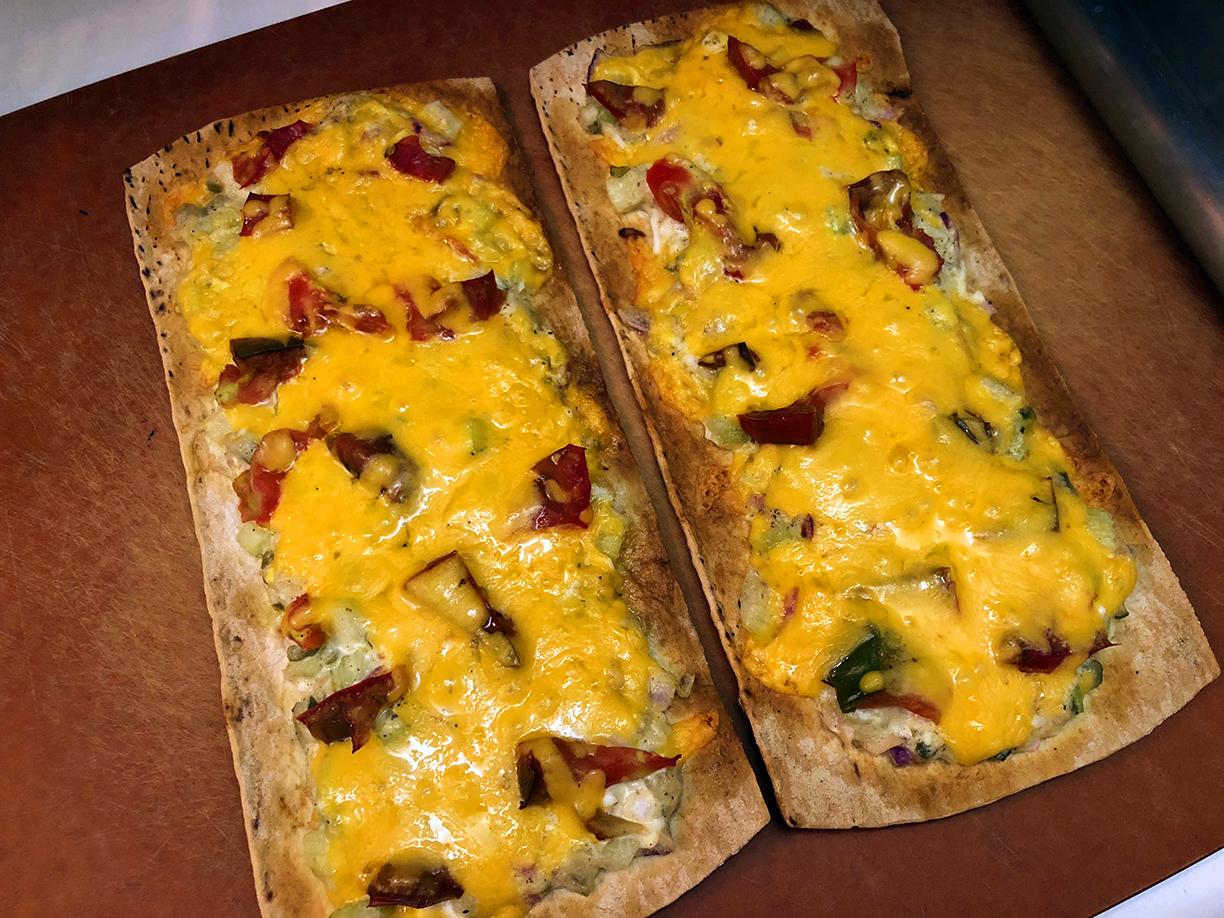 TMP fresh out of oven w tom Published September 26, 2018 at 1224 × 918 in Easy Peasy Pizzas: Deep South Tuna Melt Flatbread “Pizza” and Variations Then bake, slice and enjoy!