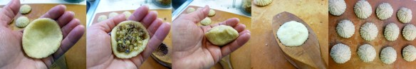 Mix butter, farina, flour and sugar well. Stir in milk to form a workable dough. (Even with softening the butter, I ended up using my hands to thoroughly incorporate the ingredients.) Shape dough into walnut sized balls. Flatten these out with your thumbs in the palm of your hand, making a little curved saucer. Spoon or place your filling in the center, and pinch the edges together into a crescent, then form gently back into a ball, press into the mold then sharply rap them out.