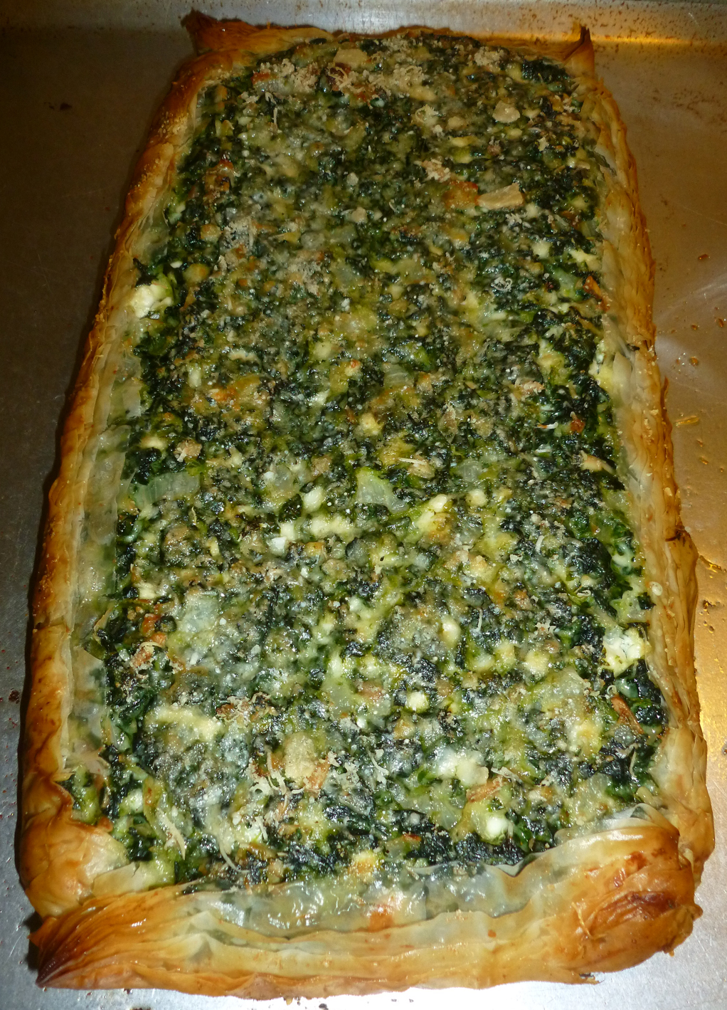 Working on the flat surface of your buttered baking sheet, lay down 1 sheet of the phyllo dough and, using a pastry brush, brush it lightly with some of the melted butter. Sprinkle about a tablespoon of the parmesan cheese over the butter, then top with another sheet of phyllo, repeating the butter, parmesan and phyllo sheets until all eight sheets are stacked on top of each other. Spoon the spinach filling down the center of your phyllo sheet, spreading it evenly and leaving about two inches of the phyllo uncovered all the way around it. Fold up the two long sides of the phyllo to just come up and over the top edge of the filling and brush the edges of the phyllo with some melted butter. Fold the two short ends of the phyllo just up and over the short edges of the filling and the ends of the long sides to make an evenly folded “package” and brush those ends with butter to seal it. Sprinkle the remaining parmesan cheese over the top of the spinach filling, and bake the tart in the oven until the tart is lightly browned on the top and the phyllo is golden brown (see photo below.) Remove from the oven and allow the tart to sit for about 5 minutes. Slice crosswise into six even slices and serve warm or at room temperature.