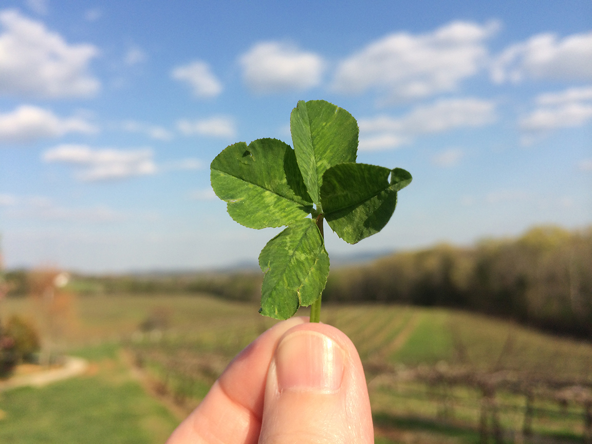Upon departing Wolf around 4:45 p.m., we had just enough time to end our day at Frogtown Cellars with a glass of “Inclination”, their distinctive full-bodied white blend of Chardonnay, Viognier and Vidal grapes. Frogtown’s main tasting room and immense deck overlooking the vines was open to the public (they close it if there’s an event and open a tasting tent further up the property), and it was a beautiful place to watch the sun go down. We took a moment to inspect the barely budding vines on the way to our car, and as I looked down at the ground I spotted this 4-leaf clover peeking up at me from amongst the grasses. Good day and good luck, indeed!